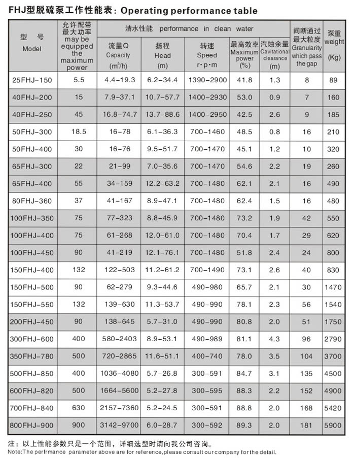 FHJ型脱硫泵是我公司在耐腐耐磨渣浆泵成功设计制造的经验基础上,针对我国烟气脱硫行业(石灰石/石膏湿法脱硫、双碱法脱硫、循环硫化床脱硫、海水脱硫和氨法脱硫等工艺)用泵的特点,吸收国内外同类产品的先进技术,精心研制的新一代高校系列脱硫泵。泵的 大流量可达180003/h,泵的扬程一般在50m以下,涵盖了所有脱硫系统用泵工况,适用于吸收塔大型浆液循环泵类、浆液泵/水泵类和污泥泵/水泵类等,主要有立、卧两种形式的脱硫泵(详见我公司资料说明)。