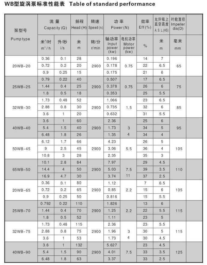 2.WB型旋涡泵共有十种型号:具体为30WB-20、25WB-25、32WB-30、40WB-40、WB-20、25WB-25、32WB-30、40WB-40、50WB-45、65WB-50、20WB-65、25WB-70、32WB-75、40WB-90。皆为单级悬臂式旋涡泵。
