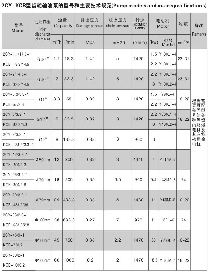 齿轮式输油泵适用于输送各种不同的油料介质液体,例如石油、重油等。液温不超过200℃,但不适用于含硫成份过高,腐蚀性的,含有硬质颗料杂物的,以及含有纤维的油料,亦不适用于输送高度挥发性的,闪点低的油类例如汽油、苯等介质液体。 标准泵组是用弹性联轴器与三机电动机直接连接后安装在铸铁公共底盘上。根据用户需求,以下11种规格可供2CY1Cr18Ni9Ti)不锈钢齿轮泵。
