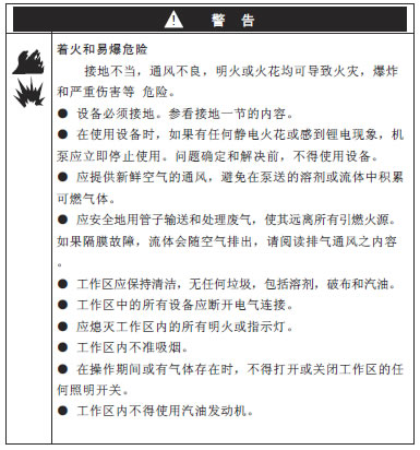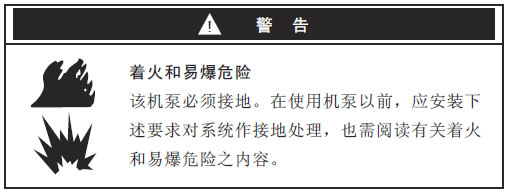 | 为减少静电火花的危险,使用或位于泵送区的机泵急其它设备均需接地。请查阅当地的电工规程,以便了解本地区有关设备详细接地规定。 |