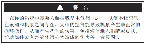 b. 将其中一个铜球阀( B )安装在靠近泵的位置,它用于御除夹带的空气,参见上述警告内容。另一个铜球阀( B )的安装位置应位于所有进气管附件的上游,它用于在清理和检修期间隔断气流。