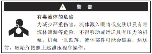 | 应经常冲洗机泵,防止泵送的流体干结在机泵中,导致机泵受损。冲洗所用的流体应与泵送的流体兼容,而且不影响系统中接触液体的部件。有关冲洗液和冲洗周期建议,可与流体制造商或供应商联系。如果机泵需持续不用,进行存储前,应冲洗机泵和卸压。 |