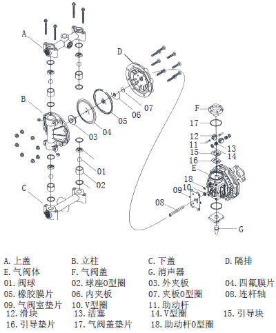 | QBY3 系列气动隔膜泵工作原理:在隔膜泵的两个对称工作腔中,各装有一块有弹性的隔膜,连杆将两块隔膜结成一体,压缩空气从泵的进气接头进入气阀室后,推动两个 B 工作腔内的隔膜,驱动连杆联结的隔膜同步运动。与此同时,另一工作腔中的气体则从其隔膜的背面排出泵外。当活塞达到行程终点,阀机构则自动的将压缩空气引入另一工作腔,推动隔膜泵朝反向运动,这样就形成了两个隔膜的同步往复运动。每个工作腔中又设置两个单向球阀,隔膜的往复运动,造成工作腔内容积的改变,迫使两个单向球阀交替的开启和关闭,从而使液体连续的吸入和排出。 |