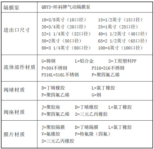 | 泵型号已标注在系列铭牌上。由字母和数字来表示。订购更换零件时,应参看零件表。下列表中是字母和数字对照表,QBY3指环科牌隔膜泵。 |