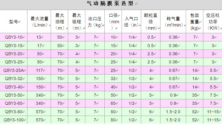 | 本公司专营的 QBY3 系列气动隔膜泵是一种新型的输送设备,是目前国内 新颖的泵类。采用压缩空气为动力源,对于各种腐蚀性液体,带颗粒的液体,高粘度、易挥发、易燃、剧毒的液体,均能抽光吸尽。 本公司专营的隔膜泵共有十二种规格。进出口尺寸分别为 1/4 〞( 10mm) 、 1/2 〞 ( 15mm ) 、 3/4 〞 ( 20mm ) 、 1 〞 ( 25mm ) 、 1.2 ″ ( 32mm ) 1.5 〞( 40mm) 、 2 〞 (50mm) 、 2.5 ″ (65mm)3 〞 (80mm) 、 4 〞 (100mm) 、 5 ″( 125mm) 、 6 ″( 150mm ) ,流体部件材质有:铝合金、铸钢、聚丙烯、 不锈钢、隔膜根据不同膜片材质分别有:丁晴橡胶、氯丁橡胶、聚乙烯、聚胶、聚醚橡胶、氟橡胶、氟塑料、特氟隆。以满足不同液体介质的需要。 |